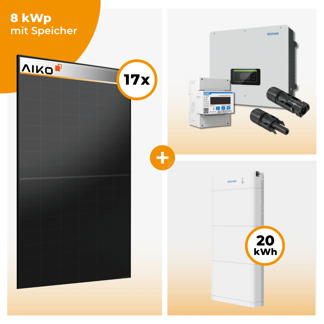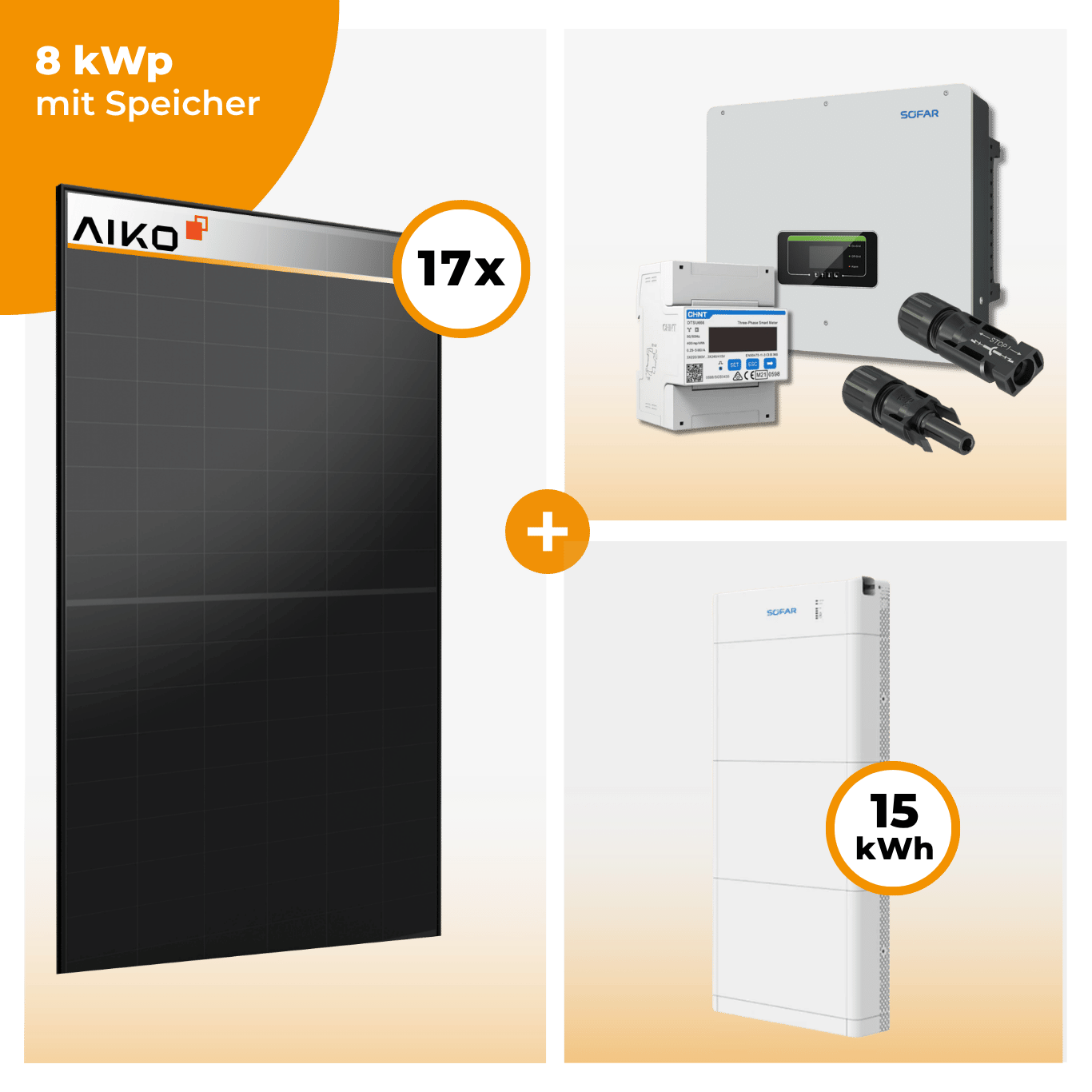 Dieses Photovoltaik-Komplettset mit über 8 kWp Leistung kombiniert 17 × Aiko 470 Neostar 3S+ Solarmodule mit dem leistungsstarken SofarSolar HYD 8KTL-3PH Hybrid-Wechselrichter und bietet damit eine der effizientesten, sichersten und wirtschaftlichsten Lösungen für Eigenheime und kleinere Gewerbeeinheiten.